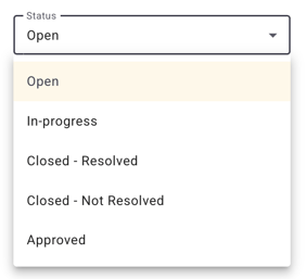 New issues have a default status of Open. The issue creator, or the issue assignee have the permission to update this status when required by clicking in the status section and selecting from the drop down list. The status can be used for filtering when reviewing issues in the Issue Dashboard.