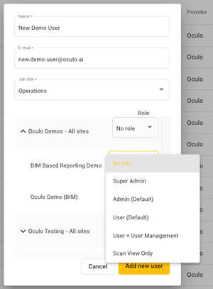 When integrating with Autodesk or Procore and using SSO, a user's Oculo permission role will be automatically selected to match their role in the integrated system.