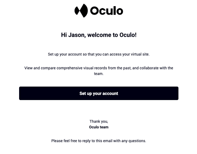 - Once your Oculo admin or Oculo account manager creates an Oculo account for you, you will receive a notification email from <help@oculo.ai> with a link to activate your account by setting a password.