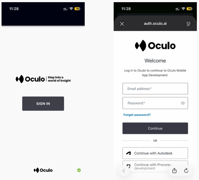 - When opening for the first time, select Sign In where you will be prompted to log in with your Oculo account details.