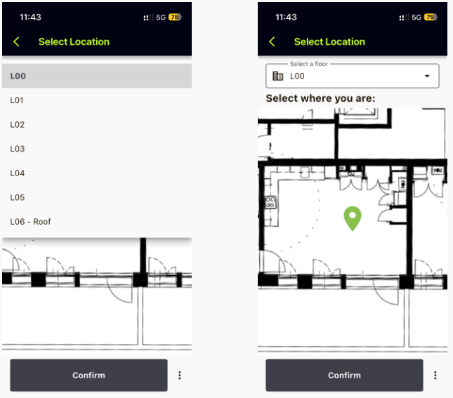 - Next you will be prompted to provide you stopping location. First choose the correct floor plan from the drop down, then move the plan behind the pin until it is in the right location.