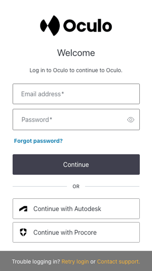 - If you have the full Procore integration enabled, then click Continue with Procore, otherwise use your Oculo credentials to sign in. If you are unsure which to use, speak to your project admin.
